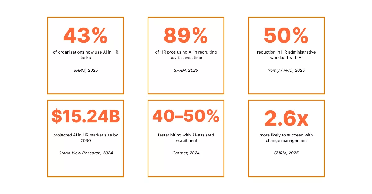 Research from Gartner (2024) indicates that AI-assisted recruitment tools reduce time-to-hire by 40 to 50%. For a growing organisation hiring 20 to 30 roles per quarter, that efficiency gain translates directly into competitive advantage: roles filled faster, revenue-generating headcount onboarded sooner, and HR bandwidth redirected toward strategic work.