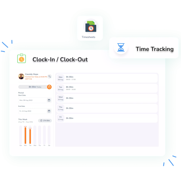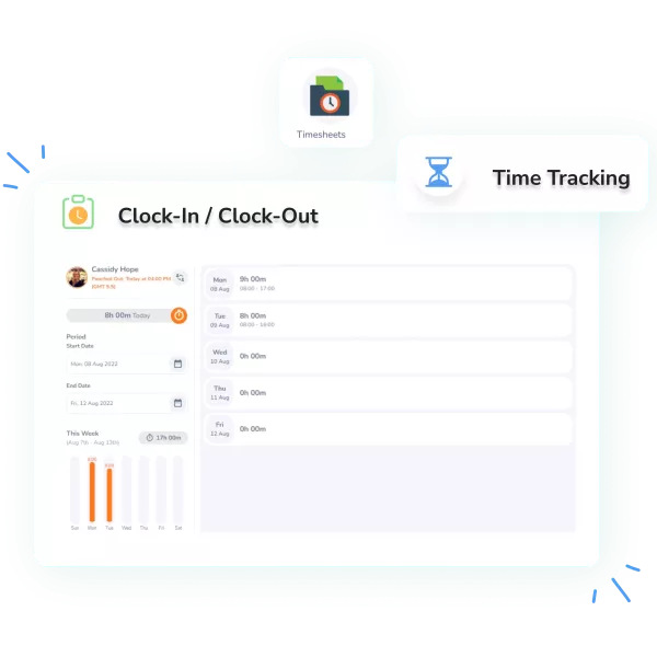 Multiple clocking methods — web punch, mobile punch (with optional geolocation), kiosk terminals, and integrations with biometric devices.
