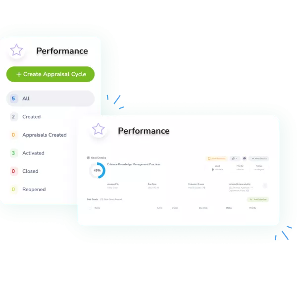 Goal setting & tracking — cascade goals from company level to teams and individuals, with progress dashboards.