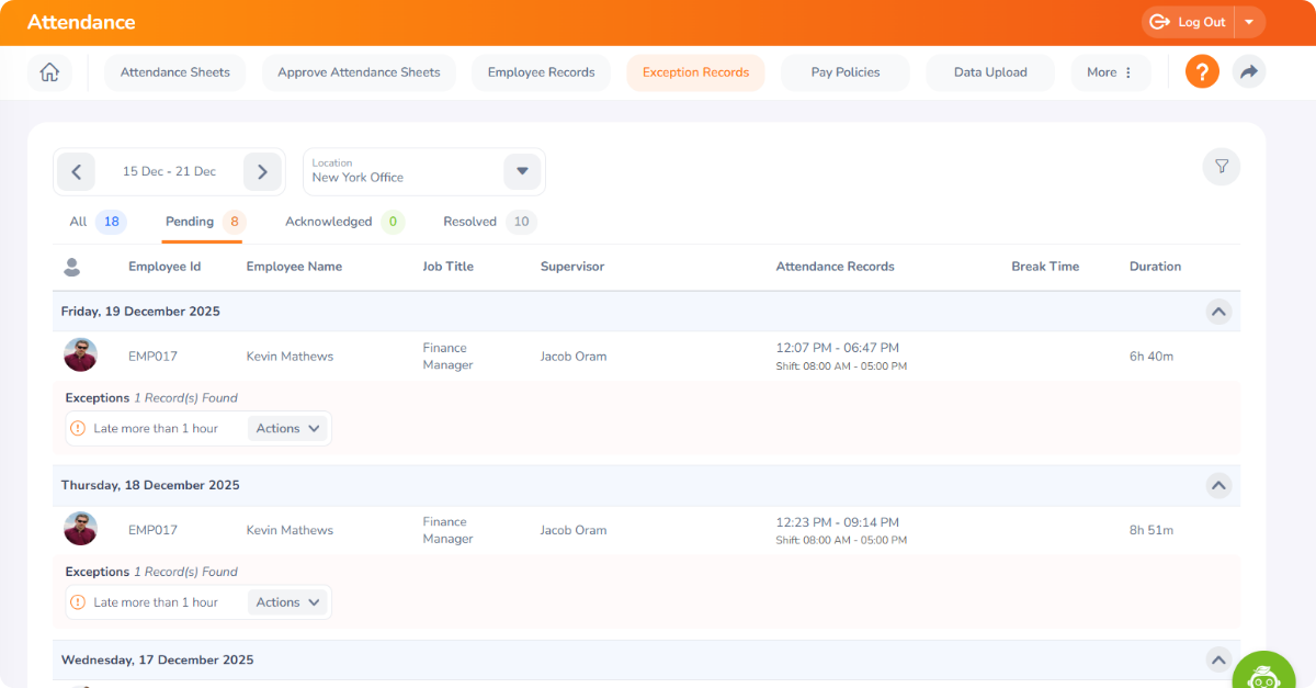 The Solution - OrangeHRM 8.0 solves this with Punch-In and Out Reminder Notifications. Employees receive timely alerts via email or the mobile app if they miss a scheduled punch. Furthermore, our new Attendance Record Exception Management flags anomalies in real-time. Instead of relying on manual timesheet audits, the system proactively detects critical deviations such as Late Arrivals, Incomplete Attendance, and Missing Records based on predefined rules. HR Admins maintain full control through flexible Exception Rule Configurations, allowing for tailored compliance logic that adapts to unique team structures and schedules. These flagged events are aggregated in a centralized UI called Exception Records, where Supervisors can take corrective actions to resolve issues. OrangeHRM 8.0 further breaks down data silos with its new Cross-Module Reporting support, seamlessly synchronizing Attendance data with the Employee Management and Leave Management modules. This integration allows administrators to generate unified reports that pair real-time attendance fields with demographic and leave records for a holistic view of workforce productivity.
