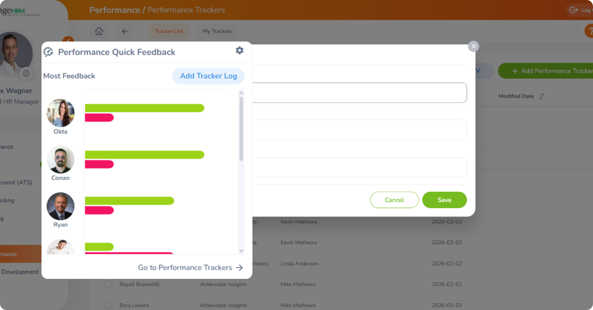 Performance Trackers - A new dashboard widget highlights the top 10 employees receiving feedback.
