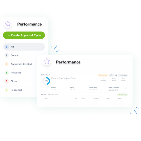 Goal setting & tracking — cascade goals from company level to teams and individuals, with progress dashboards.