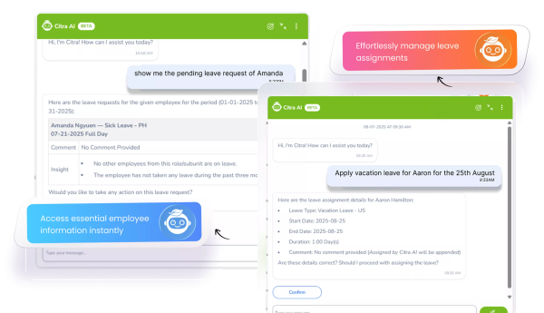 AI assistance (Citra) — employees can request/approve leave by chat, check balances, and soon get team-aware planning suggestions that minimize coverage gaps.
